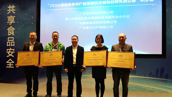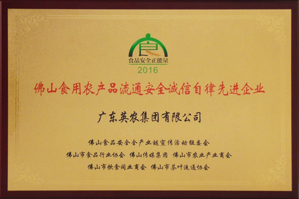 佛山食品安全全产业链宣传活动授牌典礼为33家“2016佛山食品安全诚信自律先进(优秀)企业”授牌。英农也在本次授牌典礼上荣获“2016佛山食用农产品流通安全诚信自律先进企业”称号。据悉,此次评选,是经过企业自荐参评、商(协)会推荐参评、有关职能部门审核、市民网上票选、专家学者和市民代表联合评审后,佛山食品安全全产业链宣传活动组委会根据有关评选规则,从300多家候选企业中评选出33家“2016佛山食品安全诚信自律先进(优秀)企业”。